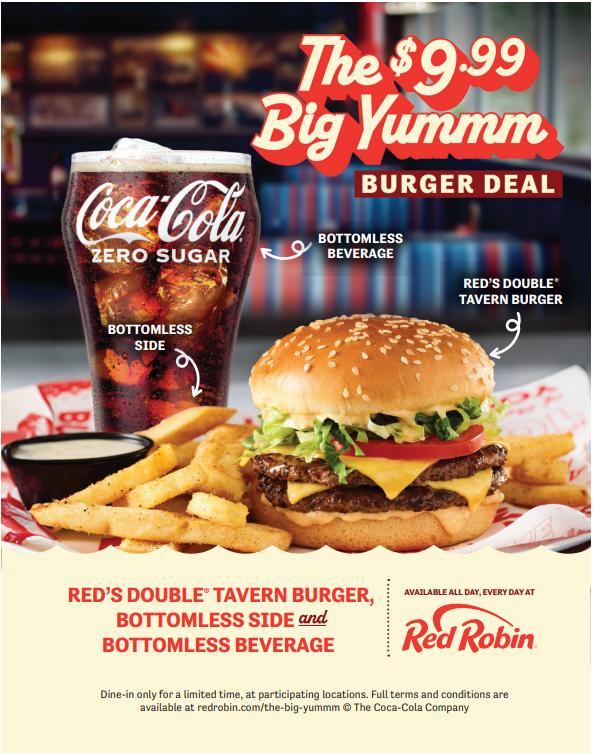 Who can resist Red Robin's Big Yummm Burger Deal? Burger, bottomless beverage, bottomless side, yes please!